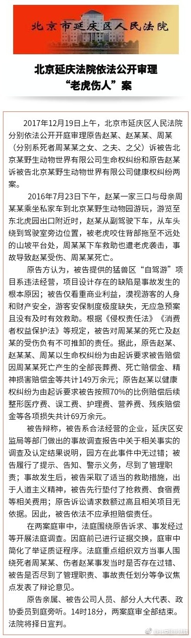 2017年12月19日上午,北京市延庆区人民法院分别依法公开开庭审理原告赵某、赵某某、周某(分别系死者周某某之女、之夫、之父)诉被告北京某野生动物世界有限公司生命权纠纷和原告赵某诉被告北京某野生动物世界有限公司健康权纠纷两案。14时18分,两案庭审全部结束。法院将择日宣判。