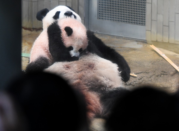 当天,“香香”与“真真”一同嬉戏,有时会吸食母乳。约20人为一组排队的游客可在熊猫馆内停留约5分钟,人们将“香香”可爱模样收入照片,并纷纷发出“好可爱”、“看上去软绵绵”的赞叹。