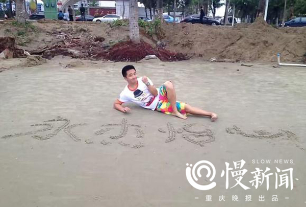 何永杰和爱人冯怡在三亚旅游时在海滩上的签名