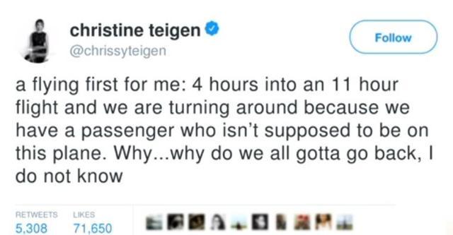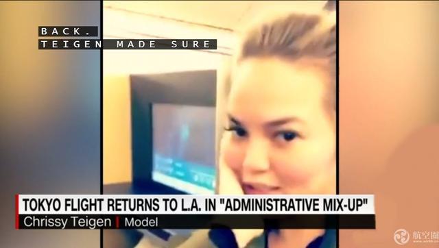 32岁的名模克莉茜·泰根(Chrissy Teigen)和 38岁的她和丈夫约翰·莱因( John Legend)12月26日从洛杉矶机场飞日本东京。飞行4个小时后,机组人员发现机上有一名乘客没有该航班的机票,而他有一张美联航的机票。随后,飞机转了一圈返回洛杉矶。