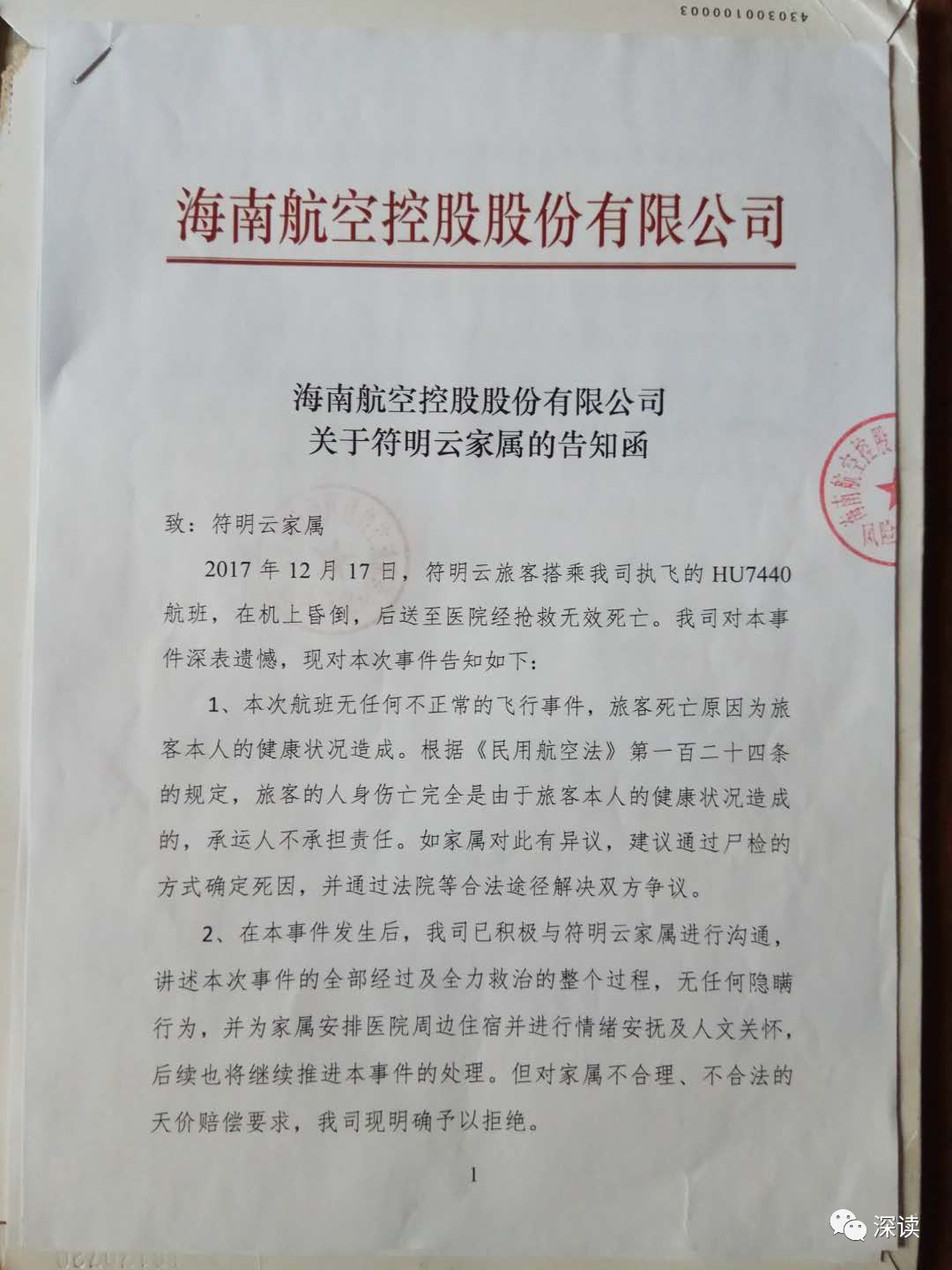 针对此事,1月1日下午,海南航空向记者回应称,12月17日,符明云旅客乘坐海南航空HU7440航班(哈尔滨-南昌-厦门)途中,因自身健康原因出现昏迷情况,乘务组立即采取急救措施,机组立即返航南昌,将其送至江西省人民医院救治,后经抢救无效死亡。