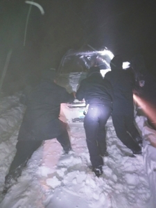 3日晚上9点,6名民警进入大雪山地区十七班垭口,风雪已经将前进的道路阻断,车辆无法前进。