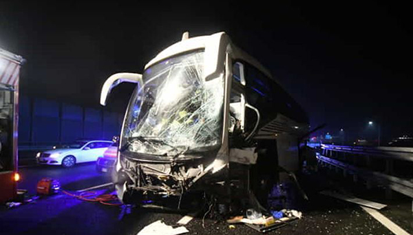16日晚20时左右,一辆载着35名中国游客的旅游大巴在米兰一高速公路上失控撞向水泥隔离带,造成多人受伤,车头严重变形。