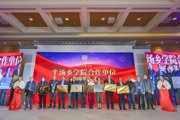 中国城镇化促进会城市与乡村统筹发展专业委员会、中国社科院健康业发展研究中心、安徽大学三农问题研究中心、安徽师范大学设计研究院、北京绿十字、安徽国际商务职业教育集团、安徽国际商务职业学院等七家单位为半汤乡学院授牌,半汤乡学院成为他们的教研、培训基地,共同探索“互联网+三农”的现代发展之路。