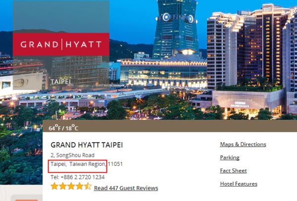 据台湾深绿媒体报道,知名饭店“台北君悦酒店”近日将官网上的饭店地址,包括中文与英文版在内,从“台湾”改为“台湾地区”、英文版改标示为“Taipei, Taiwan Region”。