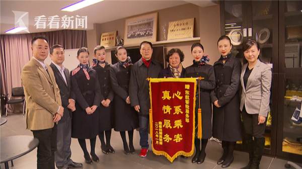刘阿姨(右四)给某航空公司机组成员送来锦旗表达感谢。 本文图片均来自看看新闻网