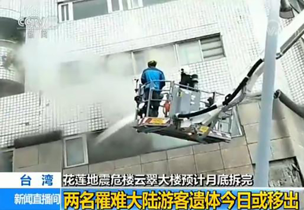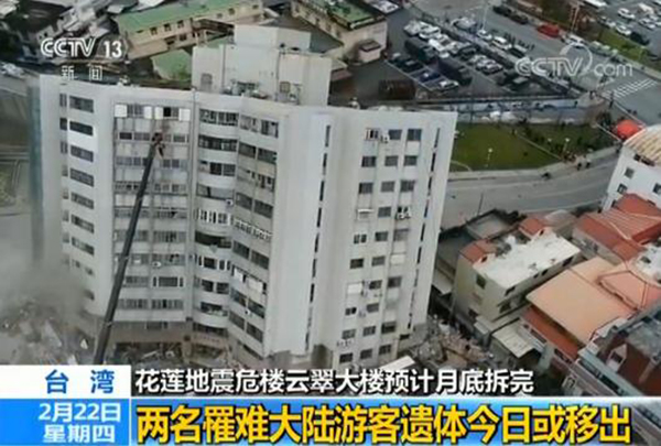 2月6日花莲6.5级地震造成花莲四座大楼倾倒,共造成17人遇难,其中9人为大陆游客。考虑到安全因素,花莲县于2月9日开始用重机械拆除统帅大饭店等三座危楼;而云门翠堤大楼201房间有两名大陆游客遗体被梁柱压住,未能运出,在征得家属同意的情况下,于11日开始进行“剥洋葱式”拆除,以减轻底层压力,拆至二楼时再将遗体运出。