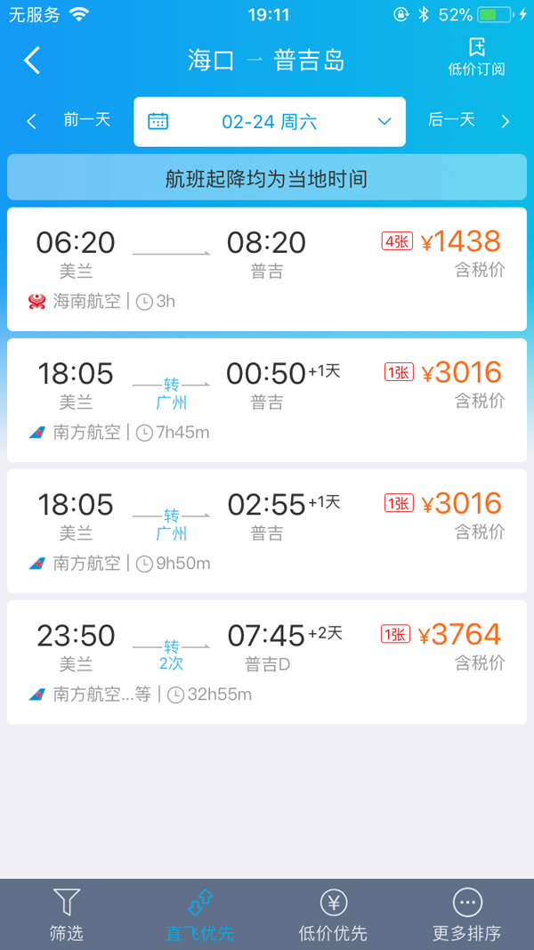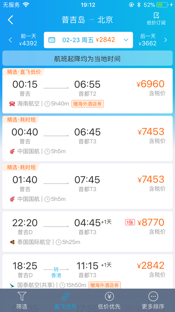 以普吉岛为例,澎湃新闻记者查询携程看到,2月24日,海口直飞普吉岛还有4张票,票价1438元。其余为中转航班,票价在3000至4000元上下。同日普吉岛飞北京的票价低位保持在3000至4000元上下,直飞航班票价最低为3662元。