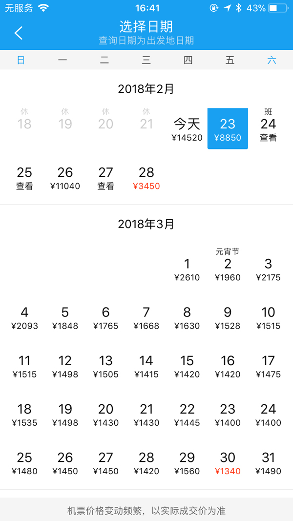 2月22日下午5时许,即便是选择更为昂贵的公务/头等舱,2月23日至27日三亚飞往哈尔滨的机票也均已售完。2月22日早些时候可查询到,在2月23日和2月26日三亚飞哈尔滨的公务/头等舱中,曾出现过最低售价为8850元和11040元的机票出售。进入2月28日,若选择直飞航班,公务舱全价为19140元。