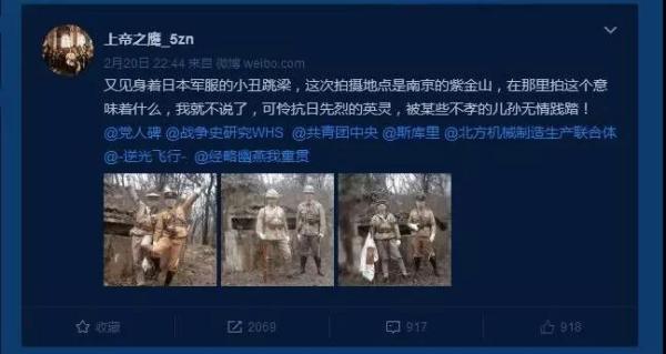 2月20日晚,网友“@上帝之鹰_5zn”发布微博称,两名青年男子身着日本军服,疑似在南京紫金山摆拍合影。