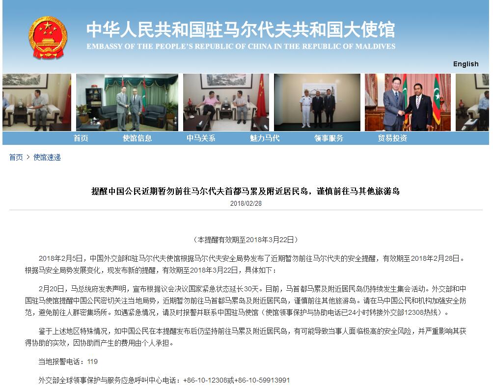此次提醒的有效期至2018年3月22日。而就在2018年2月5日,中国外交部和驻马尔代夫使馆根据马尔代夫安全局势均发布了暂勿前往马尔代夫的安全提醒,有效期至2018年2月28日。另外,本次发布的提示信息还强调,当事人可能面临的安全风险会严重影响获得协助的实效,同时因协助而产生的费用也将由个人承担。
