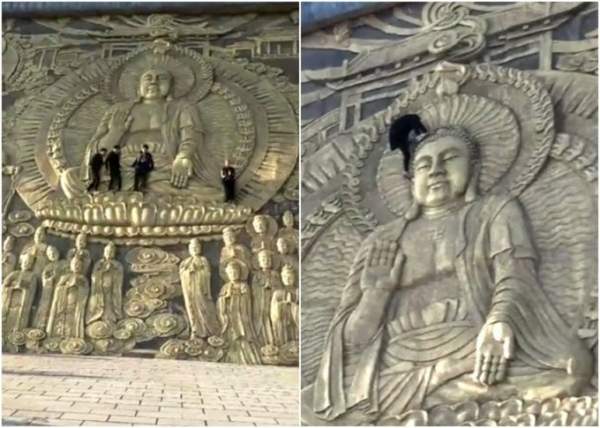 有民众近日到河南南阳浙川县的香严寺观光,发现有多名游客踩着石壁上的浮雕,爬上佛像的身体、头顶等位置拍摄大合照,举止不但缺德,而且容易发生意外。