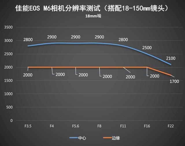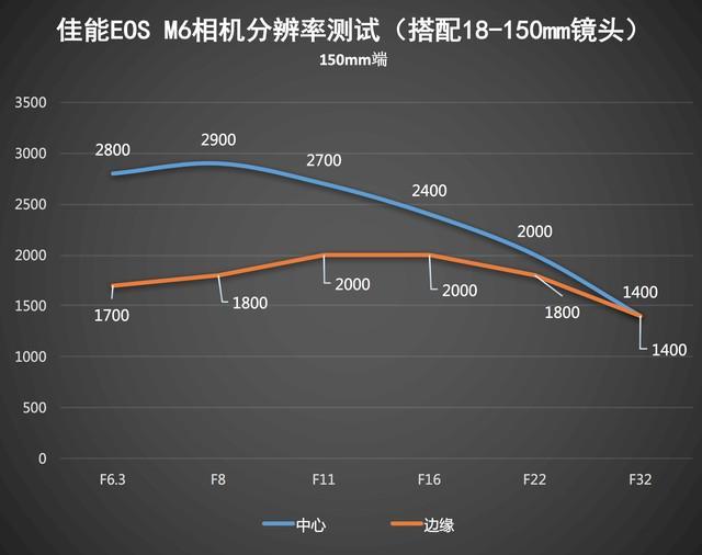 通过测试可以看到,佳能微单M6 配合自家18-150mm镜头,中心分辨率读数最高能达到2900,同时无论18mm端还是150mm端,这支佳能EF-M 18-150mm f/3.5-6.3 IS STM镜头都在F8光圈下达到了最佳画质。