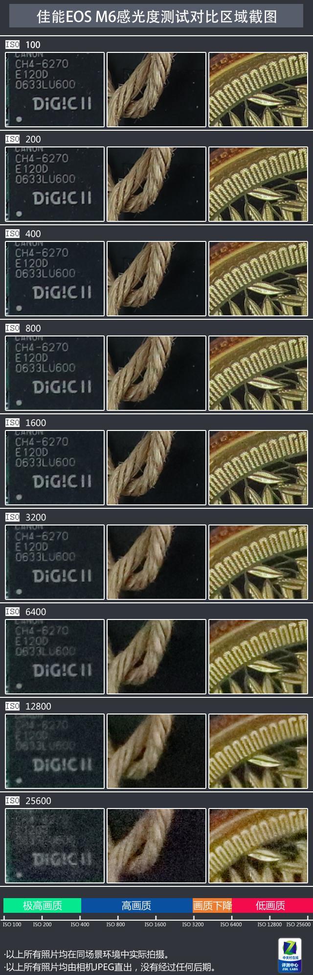 作为最新无反机,佳能微单M6 配备了全新的DIGIC 7处理器,因此其控噪算法得到进一步优化。来看高感能力的测试。