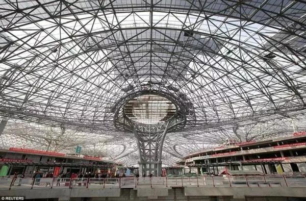 作为全球最大的机场航站楼,其屋盖钢架构的投影面积就达到 18 万平米,相当于 25 个标准足球场。如此庞大的屋盖仅用了 8 根 C 形柱作支撑,可以将鸟巢放进来。