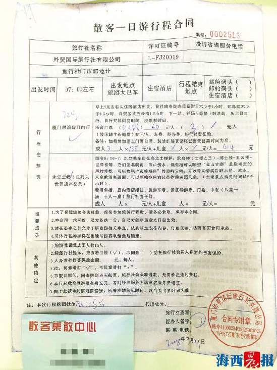 付款后,小吴询问要去哪里取联票及船票,对方回答:“明天会有车到酒店接送,到了鼓浪屿再给联票,现在签了名就能走了。”“因为已经中午,我们着急去吃饭,再加上店名看起来很‘官方’,我们就在他们给的合同上签了字。”如今回想起来,小吴觉得自己当时太不谨慎了。