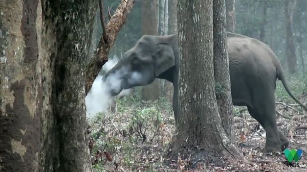 英媒称,野生动物保护协会的研究人员在印度纳加赫罗莱国家公园拍到一头野生大象吃冒烟的木炭块并呼出烟雾的不寻常行为,这让科学家困惑。