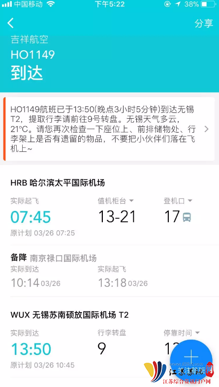 记者查询了HO1149次航班,机型为Airbus A321 (双发) (A321) ,为欧洲空中客车工业公司研制的双发中短程客机。该航班的信息显示,该航班是从哈尔滨飞往惠州的,经停无锡。哈尔滨到无锡的飞行时间为3小时20分钟。而在26日的航班信息中,这趟航班显示的是10:13飞抵南京后,13:19再从南京飞往无锡。记者查询时,执行HO1149的B-1857已于13:50从南京飞抵无锡,并于15:03飞往惠州。延误了约4个小时。