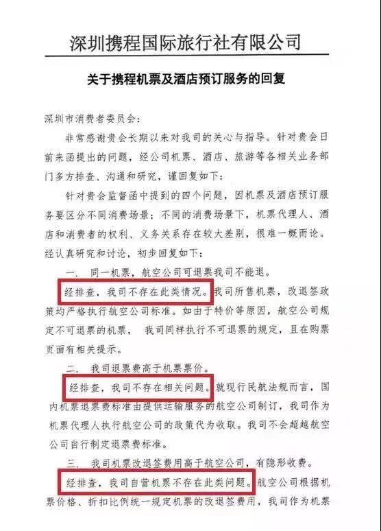 在一份由深圳市市场和监督管理委员会公布的监督函回函中,携程公司多次宣称“我司不存在相关问题”,并解释称,携程所售为特价不可退机票,且退费标准由航司制定,携程仅是代为收取。