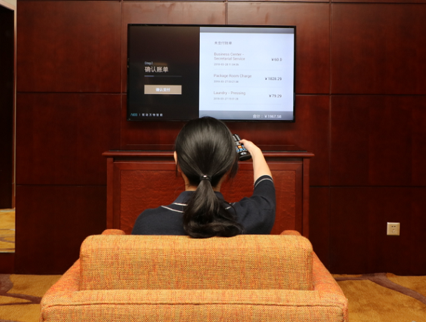 而“退房开票”同样也从智能电视主界面快速进入,相关结算信息已经与酒店结算系统打通,确认无误后提交弹出二维码,可直接扫描支付。支付后,如果需要发票,扫描开票码填写单位等相关税务信息,提交后可直接到前台打印发票(支持开具增值税专用发票),再也不用浪费时间在前台排队退房了。