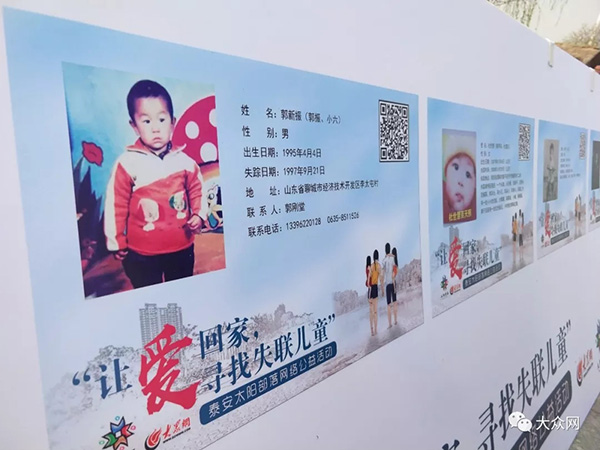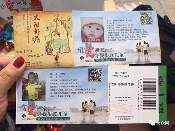 1日,在山东泰安某景区门外,几面特殊的展板引起了游客的驻足围观。原来这上面印满了失联孩子的照片及信息,这是该景区推出的一项公益活动——“让爱回家?寻找失联儿童”。不仅有爱心展板,景区还将失联儿童信息印在了门票上,发放到来自五湖四海的游客手中。