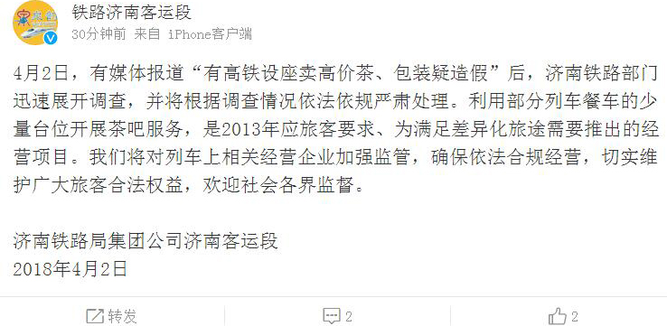 济南铁路局集团公司济南客运段官方微博4月2日发布消息,回应有媒体报道“有高铁设座卖高价茶、包装疑造假”一事。济南客运段表示已迅速展开调查,并将根据调查情况依法依规严肃处理。此外,将对列车上相关经营企业加强监管,确保依法合规经营,切实维护广大旅客合法权益,欢迎社会各界监督。