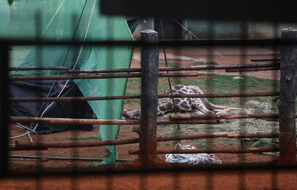 园方工作人员将长颈鹿“海荣”解救下来。@春城晚报 图