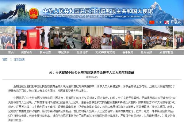 中国驻尼泊尔大使馆再次提醒赴尼中国游客,根据尼泊尔海关有关规定,尼对黄金、白银、外汇实行严格管制。严禁携带超过50克黄金或100克白银首饰入出尼境,严禁携带任何未经加工的金银入出尼境,违者会面临走私罪的指控而遭羁押并被处以重罚。