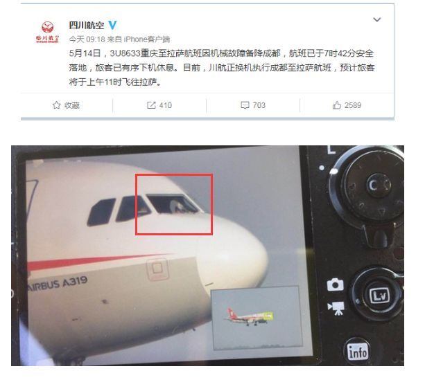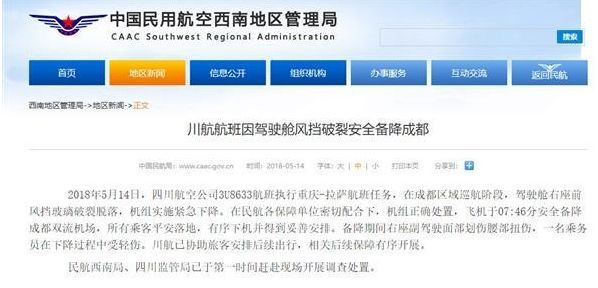 随后,中国民用航空西南地区管理局发布通告称,2018年5月14日,四川航空公司3U8633航班执行重庆-拉萨航班任务,在成都区域巡航阶段,驾驶舱右座前风挡玻璃破裂脱落,机组实施紧急下降。