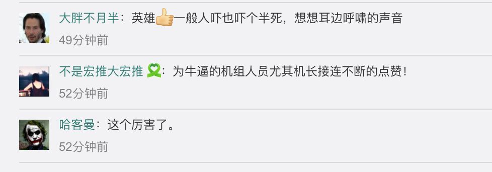 乘客称,当时飞机很颠簸,氧气面罩突然掉落,出现失重感觉,“当时以为自己要完”。很多乘客在哭,有人“吓晕了,吓吐了”。机务人员广播安慰称,“相信有能力有信心处理好”。“很感谢机长,也很担心他”,“把我们从死神旁边拉回来”。