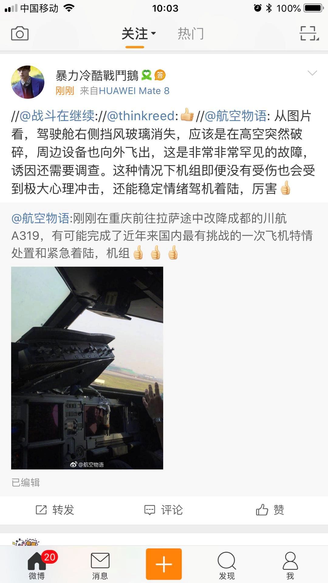 @航空物语分析,从图片看,驾驶舱右侧挡风玻璃消失,应该是在高空突然破碎,周边设备也向外飞出,这是非常非常罕见的故障,诱因还需要调查。这种情况下机组即便没有受伤也会受到极大心理冲击,还能稳定情绪驾机着陆,机组非常了不起。