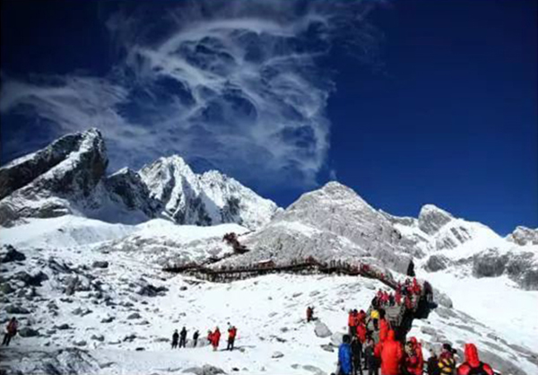 去年国庆节,玉龙雪山停车场爆满导致劝返游客,1.1万张票一早就售空。密密匝匝的排队检票人群,乍一看还以为是春运时期的火车站呢。