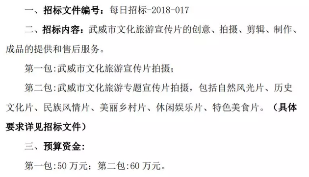 甘肃省武威市文化旅游宣传片拍摄制作采购项目招标文件显示,武威市文化旅游宣传片拍摄和武威市文化旅游专题宣传片拍摄(包括自然风光片、历史文化片、民族风情片、美丽乡村片、休闲娱乐片、特色美食片)的预算资金分别为50万元和60万元。