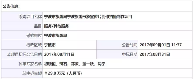 再如,2017年宁波旅游形象宣传片创作拍摄制作项目,中标金额为29.8万元。