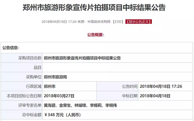 除了用错素材,让广大网友十分关注的还有此次的中标价格。中国政府采购网显示,郑州市旅游形象宣传片拍摄项目自今年3月27日发布招标公告,4月18日发布消息,中视金桥以348万元中标。该宣传片制作完工期为30天。