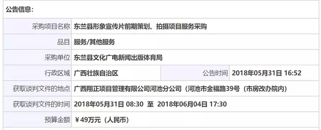 比如,还在招标的2018年广西东兰县形象宣传片前期策划、拍摄项目服务采购预算为49万元。