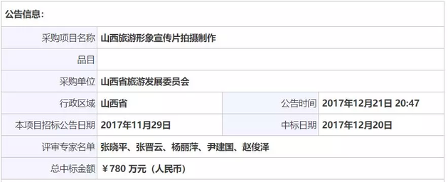 每日经济新闻(微信号:nbdnews)记者查询中国政府采购网发现,348万元的中标价格,在最近半年所有公示的旅游形象宣传片的拍摄制作项目中,可以排到第二名,第一是山西省的旅游形象宣传片(总中标价格780万元),第3名中标价格为180多万。