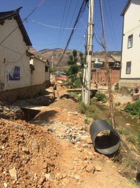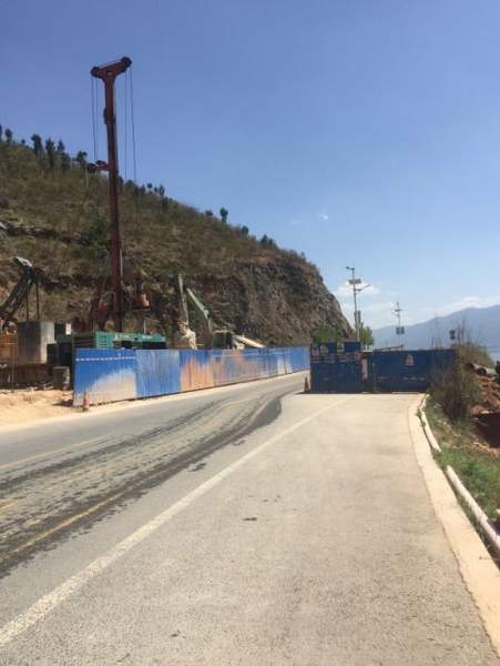 与路边冷清不同的是,在通往双廊镇境内的环海路上,每行驶一段距离,就能看到施工的场地。公路周边挖出了大约1米宽度的沟渠,黑色的塑料管道放在路边。施工围栏上的介绍显示,这正是大理市环湖截污工程的一部分。
