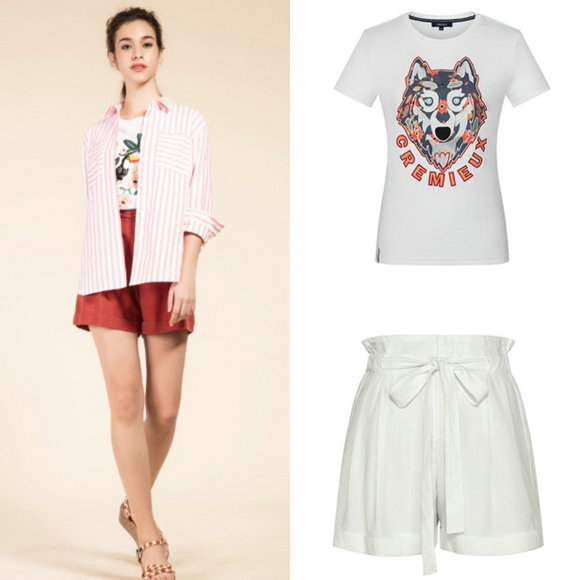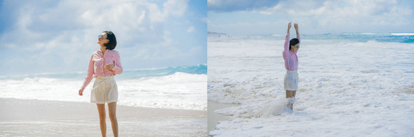 在海边,让海浪轻轻拍打双腿,感受最真实的可爱岛。CREMIEUX红白相间的条纹衬衫配上白色的短裤,打一个可爱俏皮的蝴蝶结,和可爱岛融合在一起。
