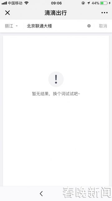 鉴于李女士的经历,记者联合周边的朋友做了个小实验,打开滴滴软件,定位丽江搜索“北京联通”,得到的是“暂无结果,换个词试试吧!”的页面,下方还有“新增地点”几个字。同样,定位昆明,搜索“北京联通”,出现的仍然是“暂无结果,换个词试试吧!”的页面。为何在丽江打滴滴的李女士行程单,终点到了北京联通?