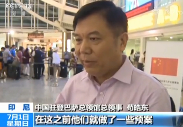 中国驻登巴萨总领馆总领事 苟皓东:这次因为比过去有经验,我们看到印尼方在这之前就做了几个预案,一方面决定机场什么时候关闭,一方面动员各家酒店为所有受到火山影响的游客免费提供一晚住宿,这个时候我们使馆也和当地的旅游协会、酒店业协会召集他们让他们告诉客人,在没有得到航班信息前,不要着急到机场来。