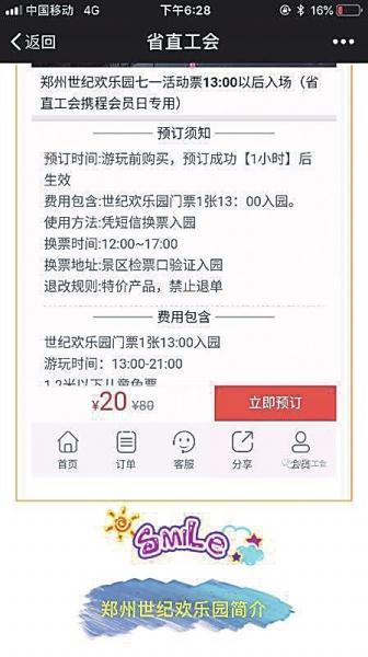 张女士说,几天前,在省直工会认证的微信公众号,她看到了一则“20元畅游郑州世纪欢乐园”的消息。上面称,世纪欢乐园有专场特惠活动,为期两天(6月30日、7月1日),会员可自行预定门票,享受工会补贴价20元/人,限量3000个名额。消息上称,换票时间为12:00~17:00,一经售出,不能退换。张女士就通过微信公众号跳转的页面,购买了两张票。