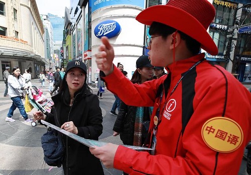 资料图片:首尔明洞大街上的中文翻译。(韩国《亚洲经济》网站)
