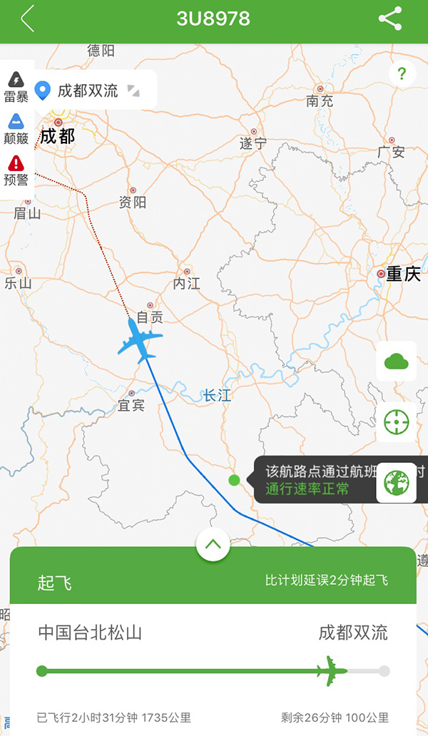 3U8978航班的飞行轨迹。 航旅纵横APP 截图