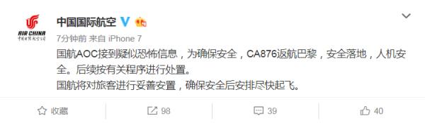 @中国国际航空7月26日消息,国航AOC接到疑似恐怖信息,为确保安全,CA876返航巴黎,安全落地,人机安全。后续按有关程序进行处置。
