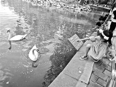 在园区天鹅湖边,有游客不断向湖中的天鹅扔自带的面包、贴饼子、生菜等,不少家长带着孩子一起扔食物。在天鹅湖湖边,每隔两三米便有一个警示牌,写着“水深危险,请勿靠近”“禁止跨越”“请勿投喂”等标语,但现场不少孩子越过黄线,靠近天鹅投喂食物。