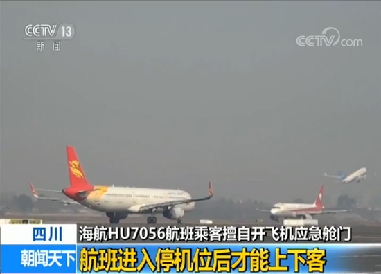 HU7056航班乘客 贾先生:没有,就大概到5点的时候,人们就开始来回问机组人员怎么回事,机组说因为没油了,来回在机场跑道滑行。因为机场没给它安排停机位,开舱门的小伙子就比较激动,当时5点多就比较激动,又过了一个小时,这个小伙子可能实在焦躁不安的,就突然冲上去把安全门打开了。