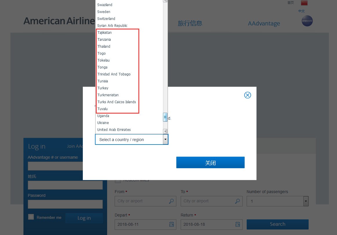 美国航空(American Airlines)系最后四家未能在7月25日前按民航局要求完成涉港澳台信息整改的公司之一。8月11日,该公司官方网站上查询机场“国家/地区”一栏已不见“台湾”选项。