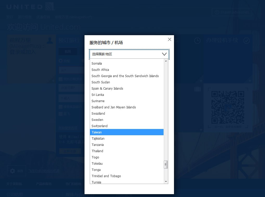 观察者网查询发现,达美航空和美国联合航空公司动作最慢,官网上机场“国家/地区”一栏,仍可见“台湾”选项,并与其他国家和地区并列。