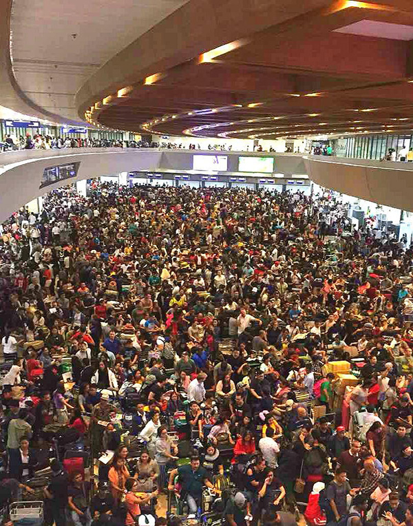 马尼拉机场T1航站楼,等候从菲移民局出境柜台办理出境手续的队伍排到了候机大厅。 视觉中国 图